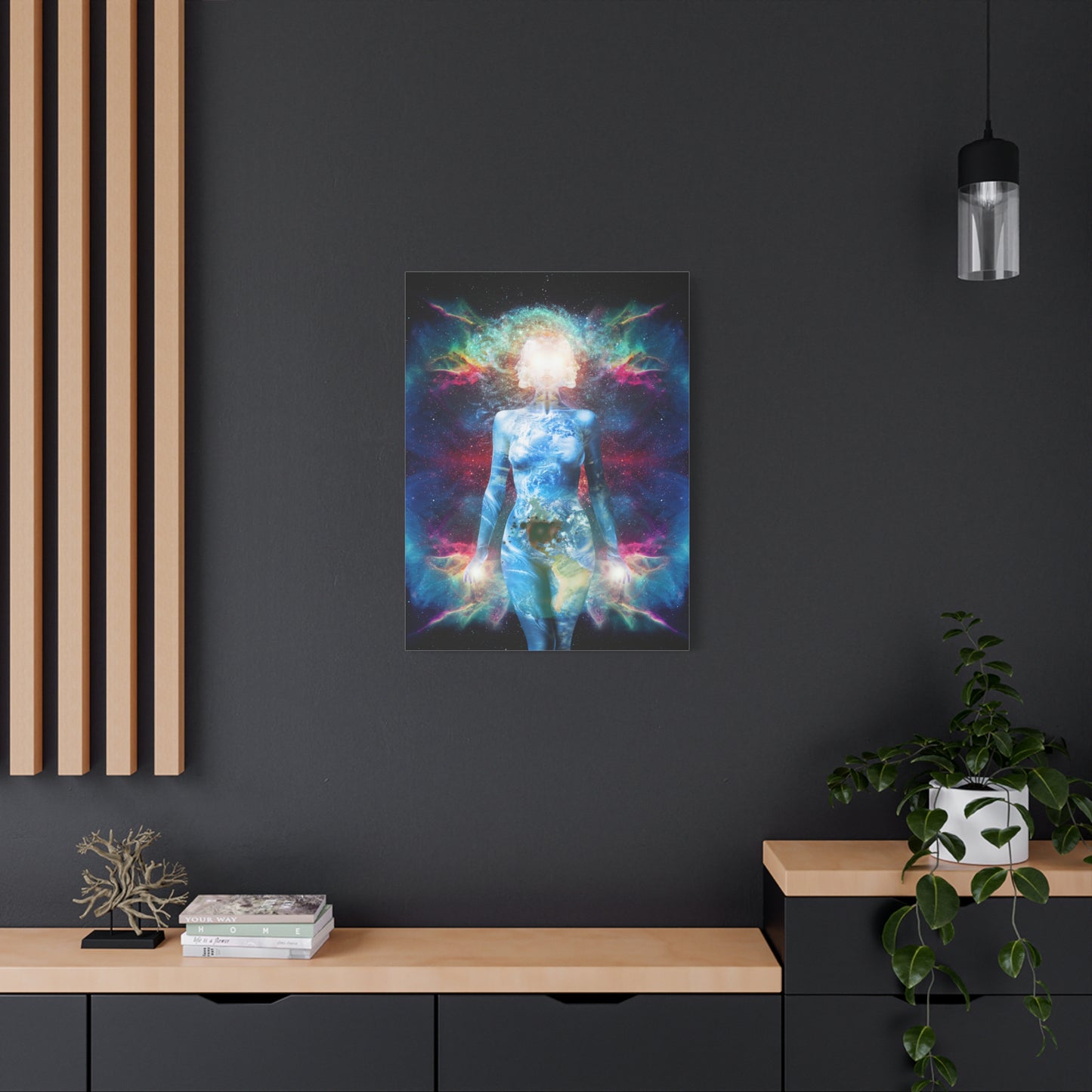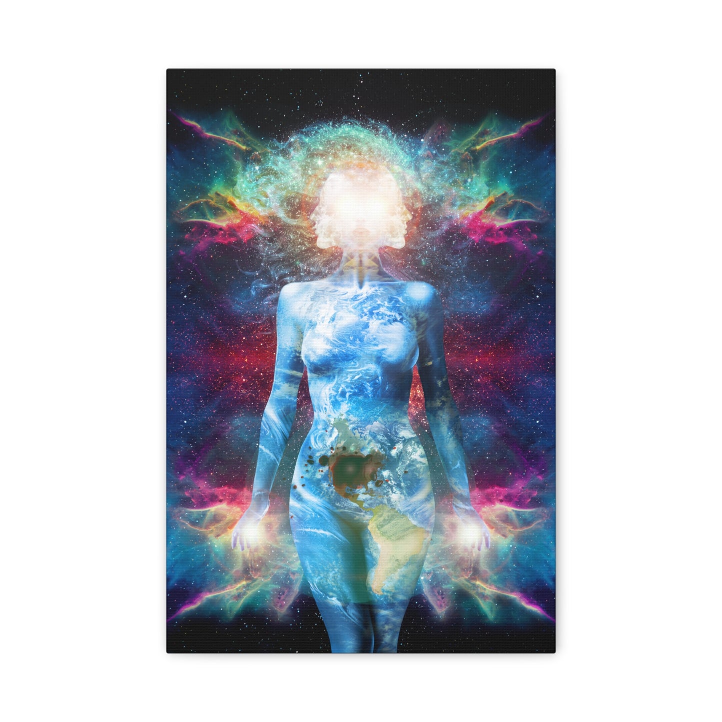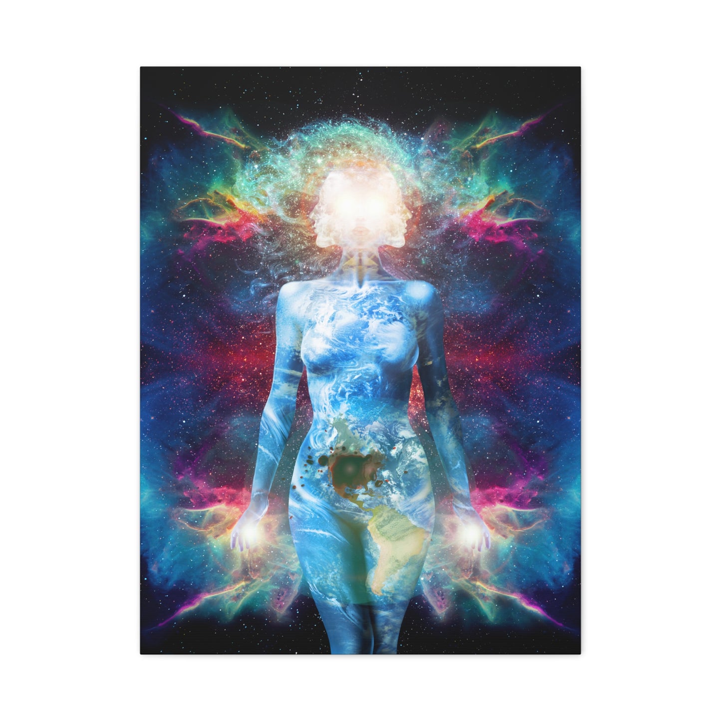 This artwork touches on the triple goddess iconography, as well as the theory of everything that delves into the idea of a living, sentient Earth.