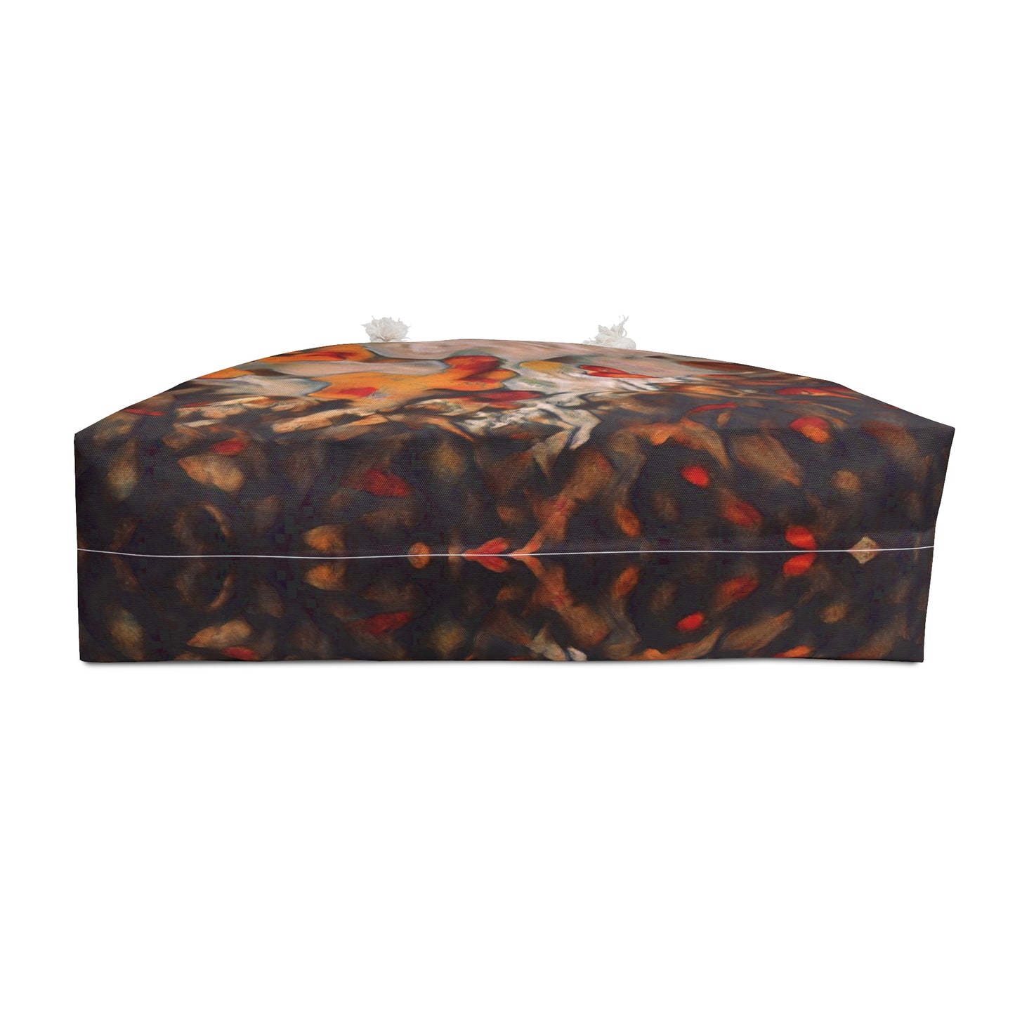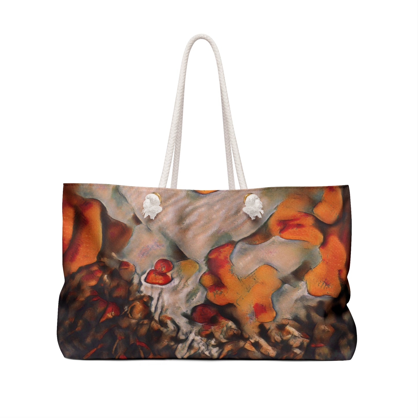 This wide-mouthed bag features a T-bottom and cream colored interior lining. The weekender art bag holds a generous amount of items and is easily held by its thick rope handles.