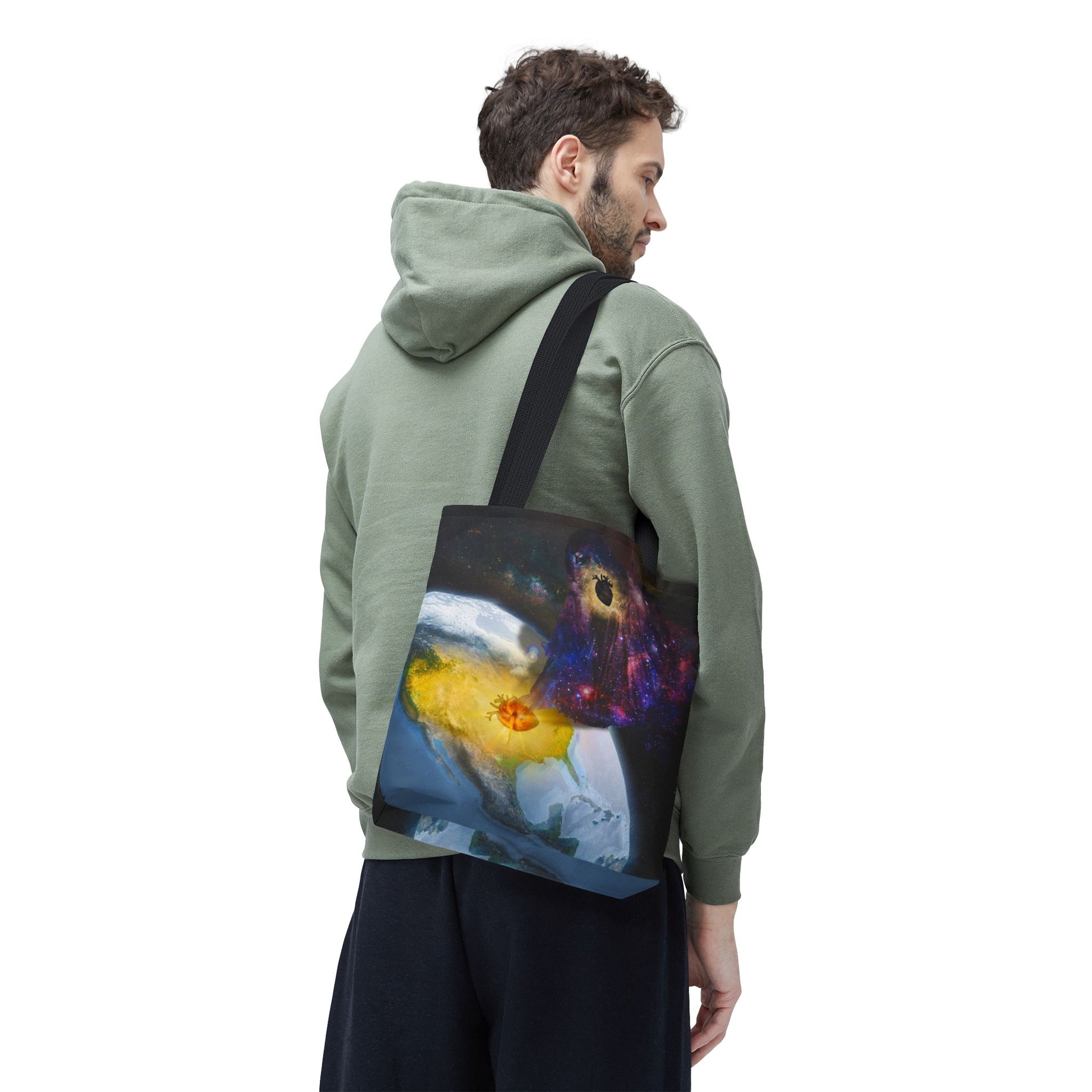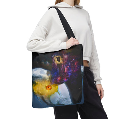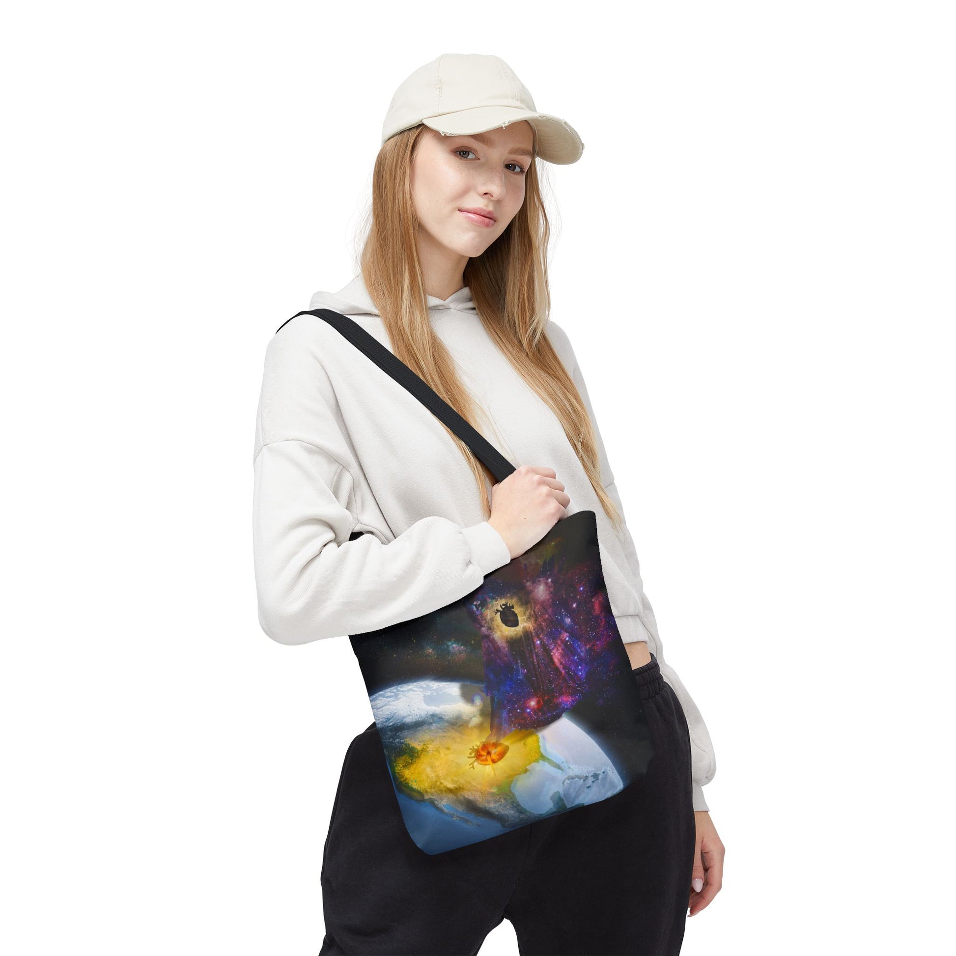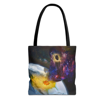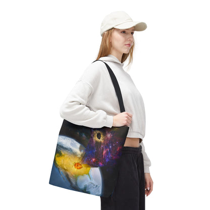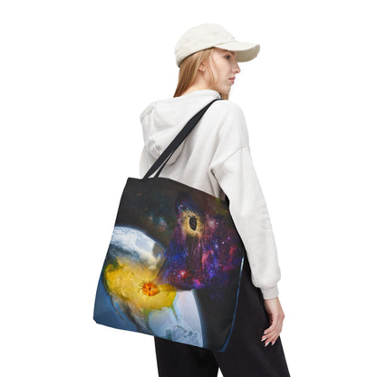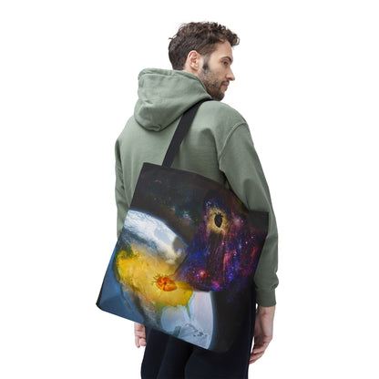This surreal art tote bag comes in three size options. Made from spun polyester, it features double-stitched seams, cotton webbing straps, and non-woven laminate lining for long-lasting durability.