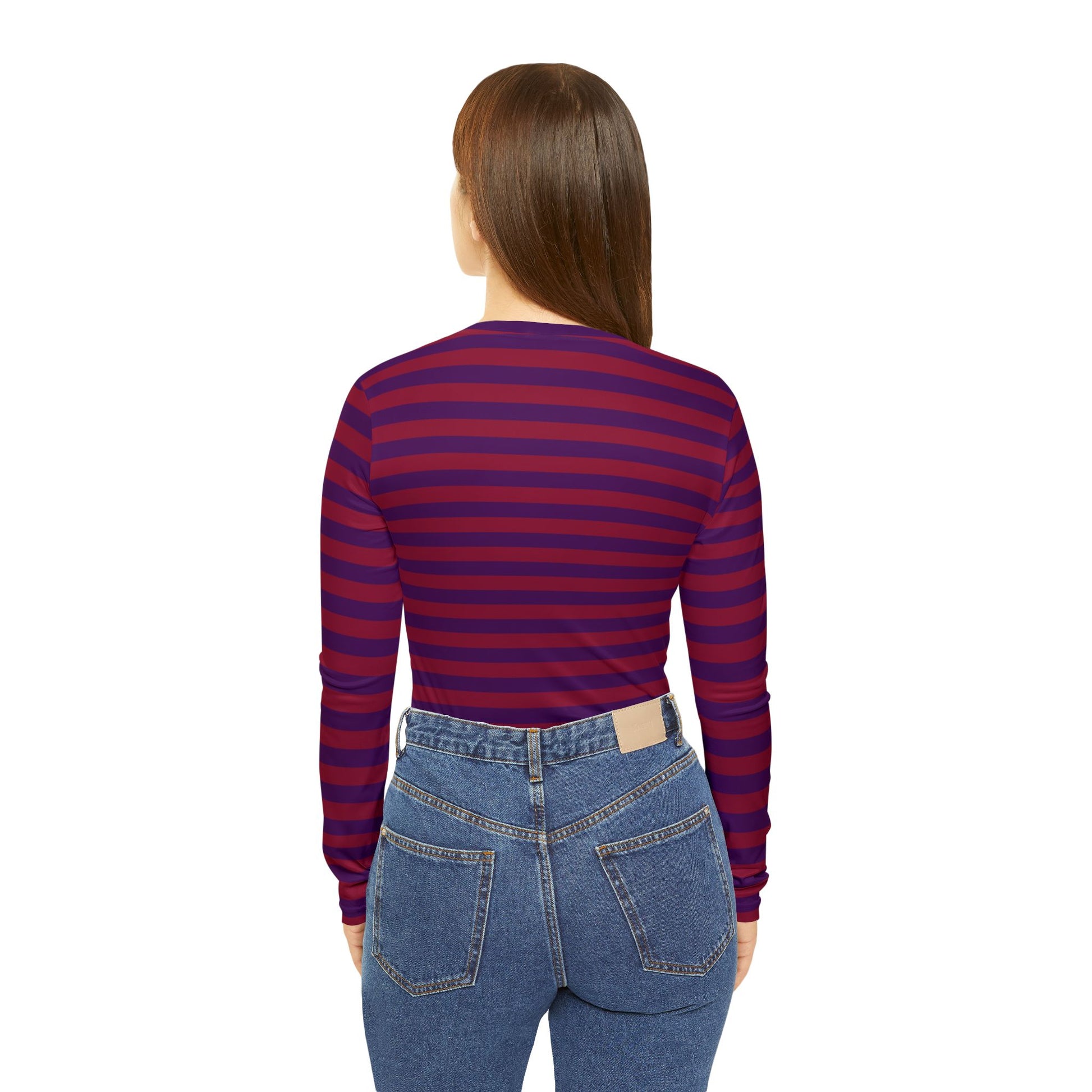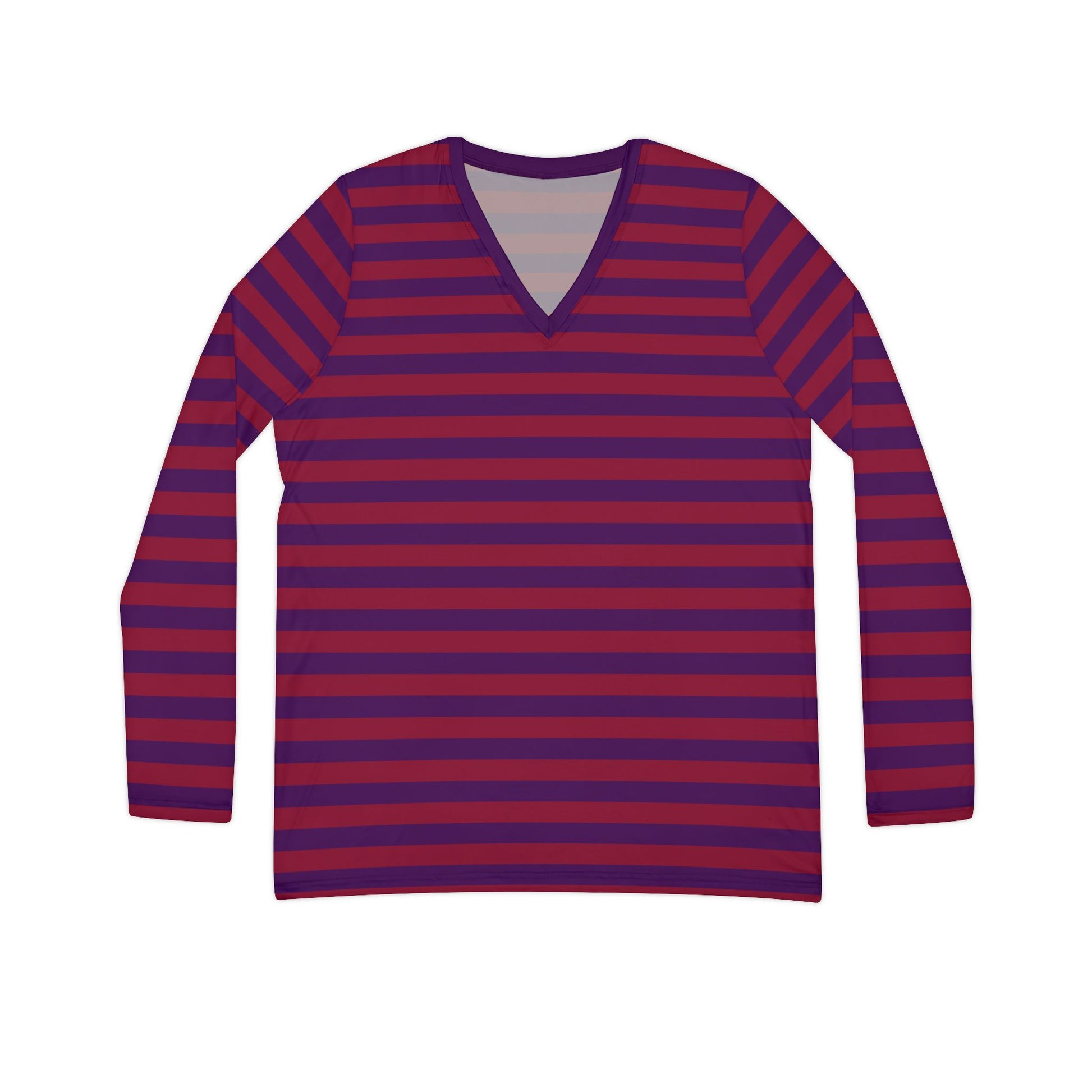 Red + Purple Skinny Striped Women's Long Sleeve V-neck Shirt