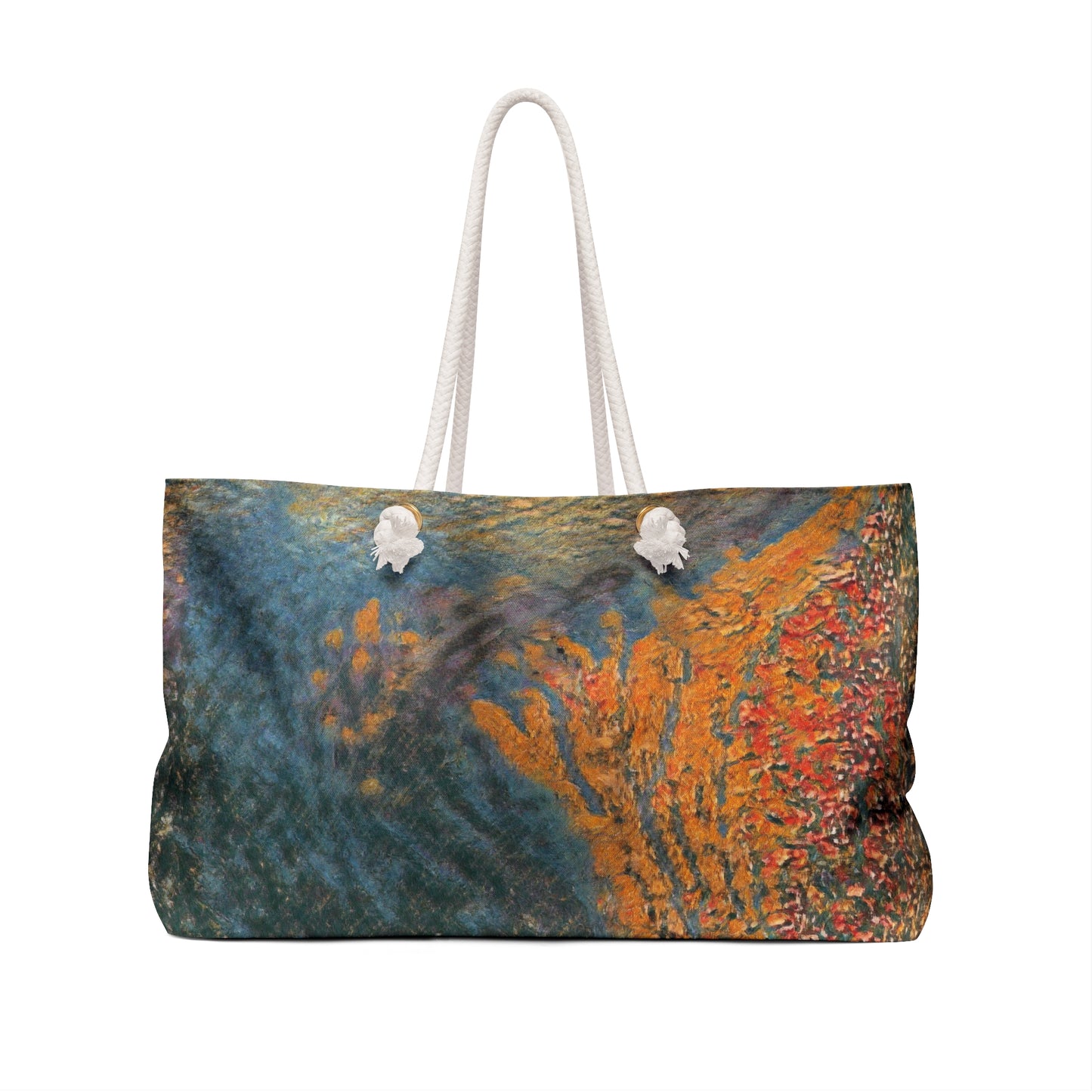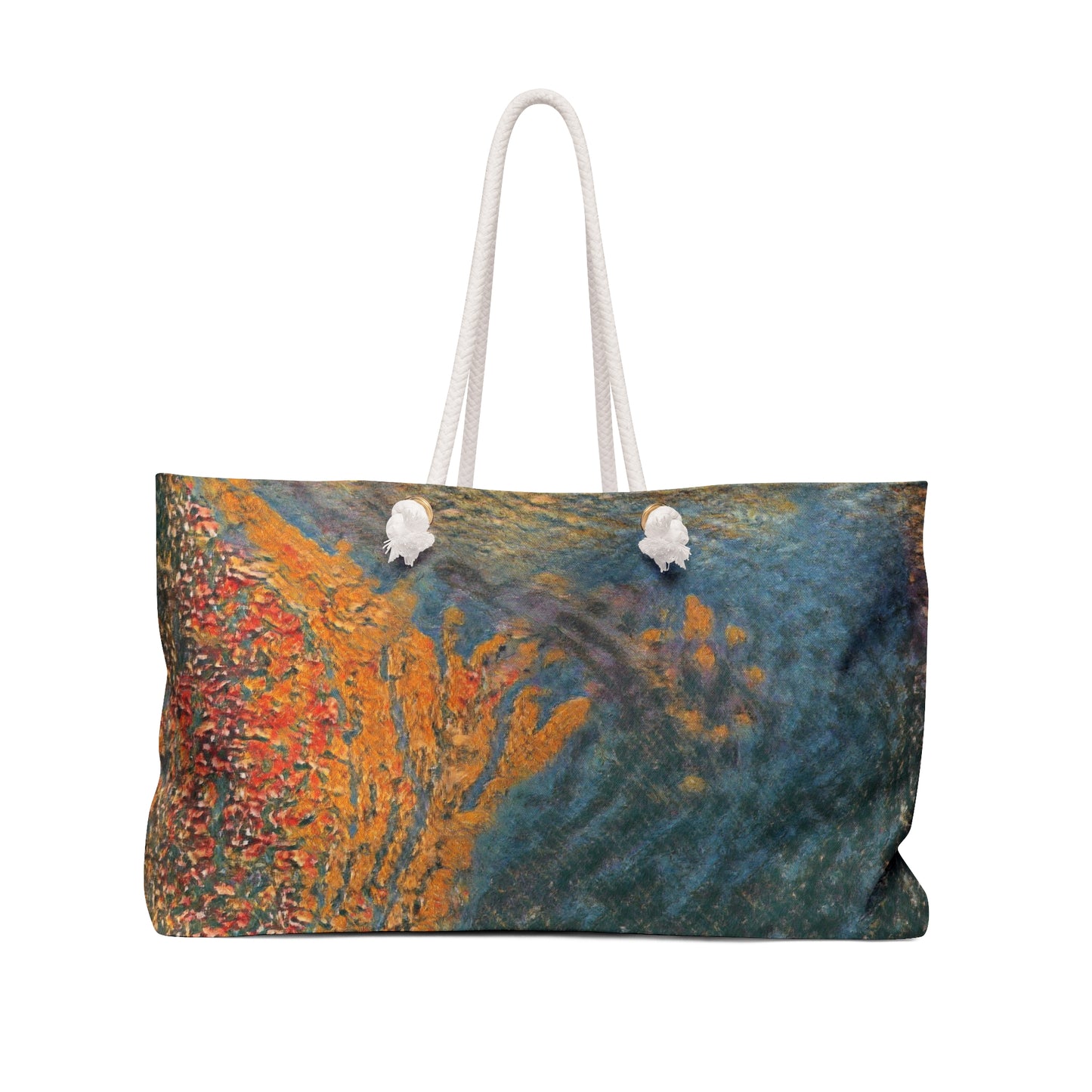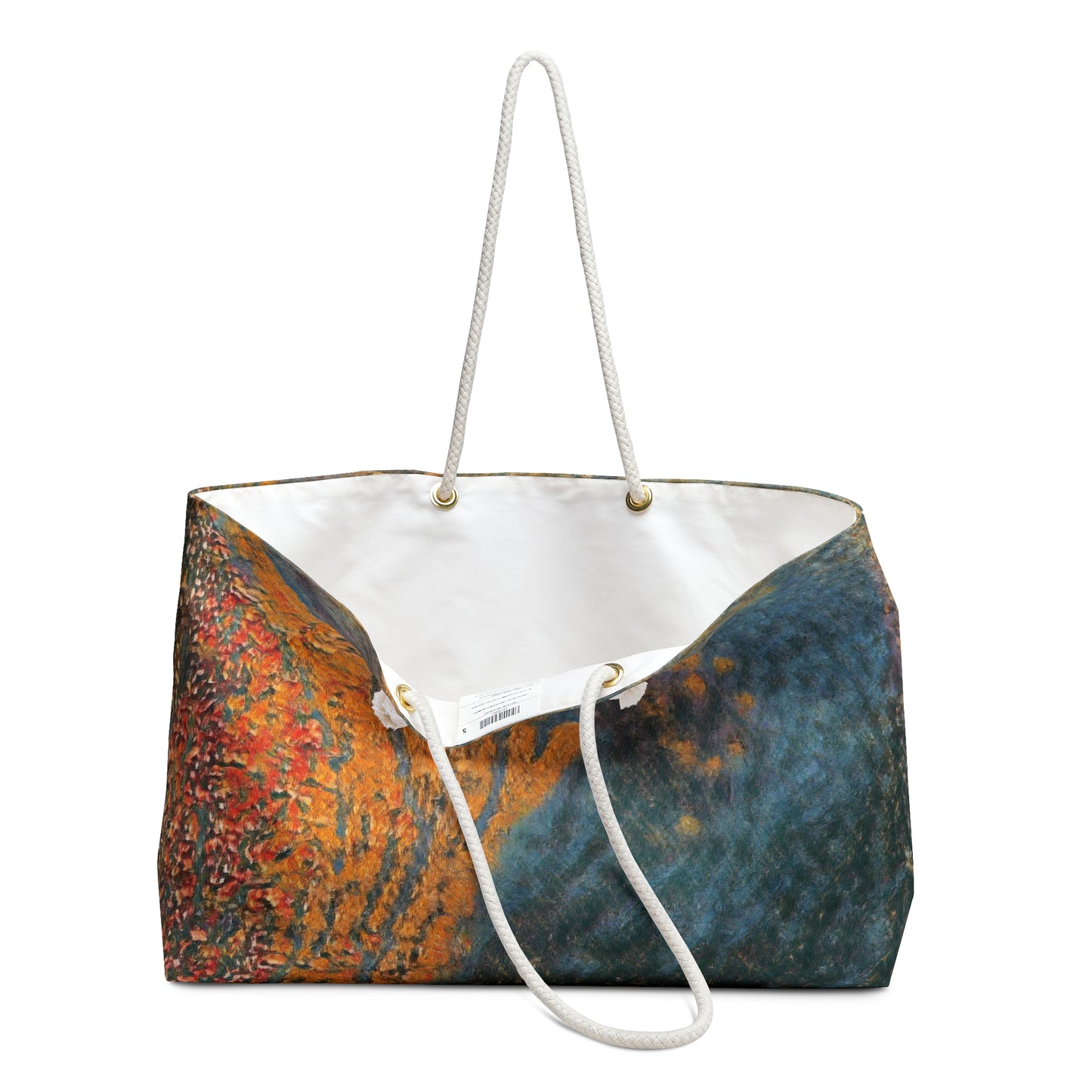 This wide-mouthed bag features a T-bottom and cream colored interior lining. The weekender art bag holds a generous amount of items and is easily held by its thick rope handles.